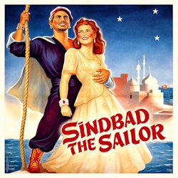 In March of 1944 RKO Studios producer William Pereira proposed to studio executives to follow-up on the success of their swashbuckler film The Spanish Main (1945) with a new effort in the genre. Douglas Fairbanks Jr., who had just returned from a five-year WWII stint in the US Navy, would star in the titular role. Stephen Ames who produced “The Spanish Main” was assigned to produce the film, and he hired John Twist and George Worthing Yates to write an original screenplay based on the eighth voyage of Sinbad. A budget of $2.5 million dollars was provided and Richard Wallace was tasked with directing. A fine cast was assembled to join Fairbanks including Maureen O’Hara as Shireen, Walter Slezak as the villain Melik, Anthony Quinn as the Emir of Daibul, George Tobias as Abbu, and Mike Mazurki as Yusuf. The story draws inspiration from the 8th Voyage of Sinbad, which is set in the early 9th century C.E. and involves the search for the lost treasure of Alexander the Great. Sinbad secures a ship but must forge an uneasy alliance of convenience with villainous Melik who stole his map, memorized it, and then burnt it. After many adventures and overcoming Melik’s tracheary, Sinbad succeeds with his quest to secure the treasure, and wins the hand of the beautiful Shireen. The film was a modest success earning a profit of $300,000. critical success was tepid and it secured no Academy Award nominations. The film’s poor performance pretty much ended the viability of the swashbuckling genre.